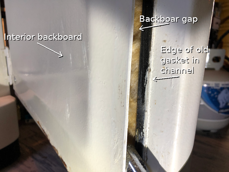 The previous owner at some point tore out the original gasket since it was no doubt old and brittle, then atop the backboard glued down a foam gasket. This left the channel and gap around the backboard exposed to the external environment, which drew in a lot of warm air causing the compressor to run a lot and subsequently produced a lot of condensation. If the foam gasket were applied in such a way that covered the gap and channel, it wouldn't have been nearly as bad...