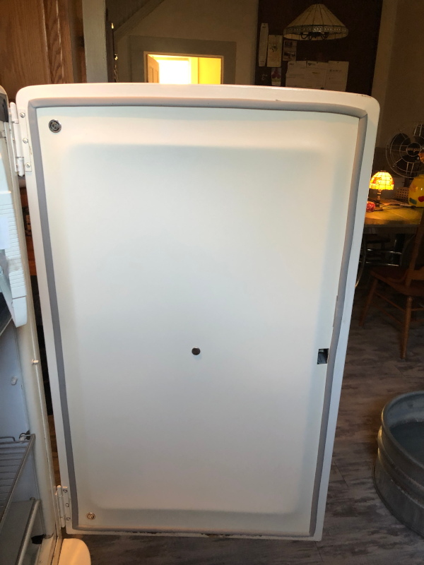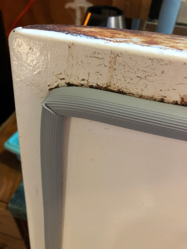 Upon close inspection, I realized that the lousy replacement gasket that the previous owner installed was actually installed in completely the wrong spot. I had to research some of the mechanics in how the door and gasket are supposed to function, which I found very interesting! The gasket is supposed to fit into a channel, and overlap onto the interior backboard. This is important because the backboard and fitting gasket are designed in such a way that when the door closes onto the fridge, the cold air causes a suction effect that draws the door in tight, compressing the gasket onto the backboard which squeezes it down around the edges upon the channel. The latching mechanism is mechanical and also draws the door in too, so this is all a bit different to modern fridges that employee magnets.