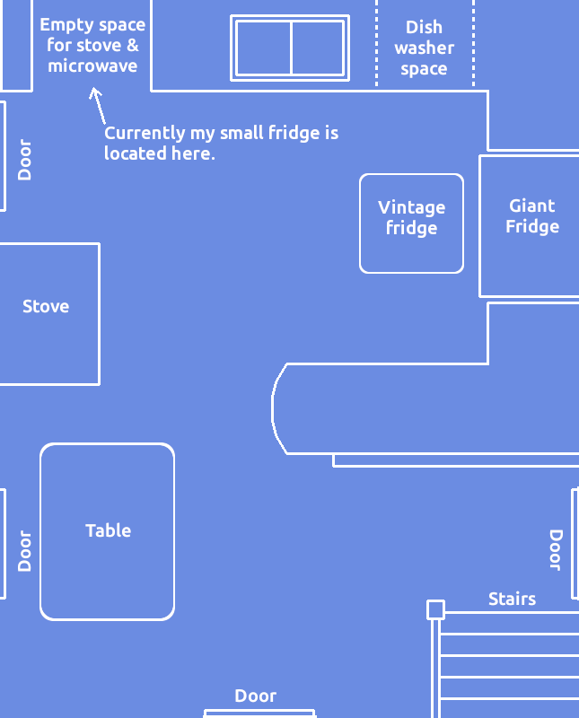 There's a space for a dish washer beneath the counter top beside the sink, but I threw out the washer since it was junk. I might buy a dish washer in the future to place there, but I never use em so I don't know. The original spot for the stove is just in a terrible location that would be better fit for a fridge. At present, the space isn't wide enough for my old fridge, so I'll probably have to expand it by knocking out the side cubby.