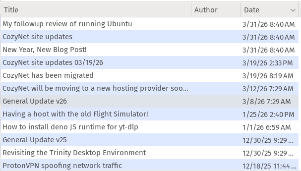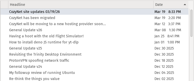 The first image is Akregator with the CozyNet feed dates out of order. The second image is Liferea with the correct order.