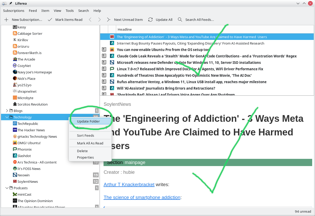 As for RSS News readers, Liferea has been the only one I've seen that actually works worth a darn. All of the modern alternatives out there have zero organization and poorly attempt to force users into meta-data tagging their feeds into "categories" (information that's non-exportable to other clients by the way because it's not part of the OPML format) rather than just giving you a dang folder. I hate that junk and want a folder! And not only that, but I also want to "fetch" the feed status per-folder instead of fetching everything all at once because I still have well over a hundred different feed subscriptions, and not all of those I care to read but maybe once or twice out of the year.